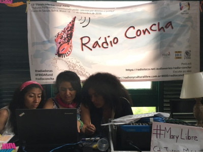 - Women at Radio Concha booth at the 2016 AWID Forum. This image was shared as part of 16 Days campaign action (2016) sharing photos of women and girls using tech. Photo by Dhyta Caturani