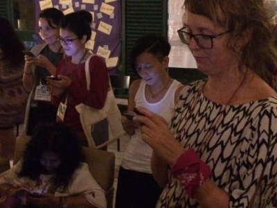 - Women engage in autonymous, anonymous public sexting at the Feminist eXchange Hub at the 2016 AWID Forum. This image was shared as part of 16 Days campaign action (2016) sharing photos of women and…