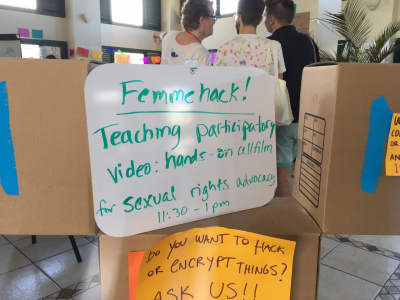 - Women participate in "Teaching participatory video: hands-on cell film for sexual rights advocacy" at the Feminist eXchange Hub at the 2016 AWID Forum. This image was shared as part of 16 Days…
