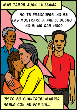 El chantaje en línea puede involucrar la publicación de fotos íntimas en los así llamados sitios de "porno venganza" (sitios web que en forma maliciosa y sin autorización publican imágenes íntimas) acompañadas de exigencias de dinero para borrarlas.
