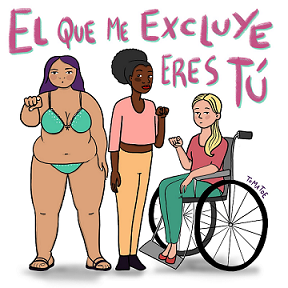 « Trois femmes dans un plan d’ensemble pointent du doigt vers l’avant, au-dessus de leur tête il est écrit « Celui qui m’exclut, c’est toi ». Ce sont trois femmes très différentes : l’une est en bikini, elle a de larges hanches, un ventre prononcé et des cheveux violets; la femme du milieu est mince et noire avec les cheveux frisés; la dernière est en fauteuil roulant, elle est blonde avec des cheveux longs. Toutes trois ont une expression sérieuse. L’image est un dessin aux couleurs pastel. »