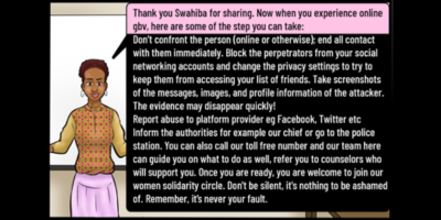 Le troisième objectif avait pour but de créer une communauté de connaissances, d’expertise et de soutien face à la cyberviolence basée sur le genre. À cet effet, les contenus sonores et visuels, faisant état du contexte et de l’expérience sur place, ont pris la forme d’un podcast et d’une bande dessinée. Le podcast a donné la parole à la féministe et bénéficiaire de la formation en CBG, Belinda Adhiambo, à la responsable du projet Risper Akinyi, à l’experte en cybersécurité Winnie Akoko et à la spécialiste des politiques de genre et de technologie Mwara Gichanga. Son but était de faire tomber les mythes et les idées fausses concernant la cyberviolence, de parler des différentes formes que peut prendre la CBG et des liens qui existent entre la VBG en ligne et hors ligne. Les spécialistes ont examiné l’impact de la CBG et abordé la sécurité numérique, les responsabilités de la plate-forme et les stratégies de réponse.