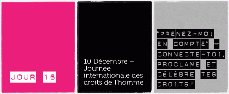 - “Je suis une femme qui utilise beaucoup l'internet et qui est sans arrêt confrontée à du harcèlement – Article 3: Tout individu a droit à la vie, à la liberté et à la sûreté de sa personne. PRENEZ-MOI EN COMPTE”.