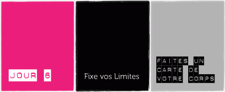 Tracez le contour d'un corps et choisissez des couleurs différentes pour représenter ce qui est privé, ce qui est public et ce qui varie. La carte de votre corps peut prendre des formes différentes en fonction des gens qui sont autour de vous ou de l'espace ou vous vous trouvez. Vous pouvez peut-être en parler avec vos partenaires ou vos amis. Faites-nous voir votre carte en téléchargeant l’image sur ce site. Consultez la collection de cartes de corps pour voir comment les limites varient entre les âges, les sexes, les cultures, les communautés, les espaces et autre.